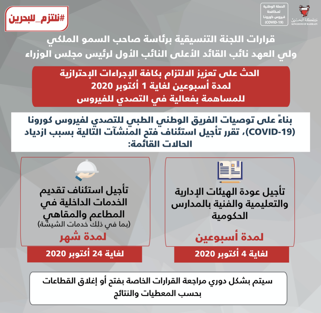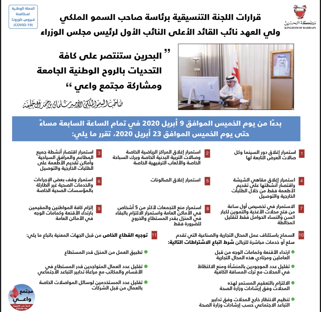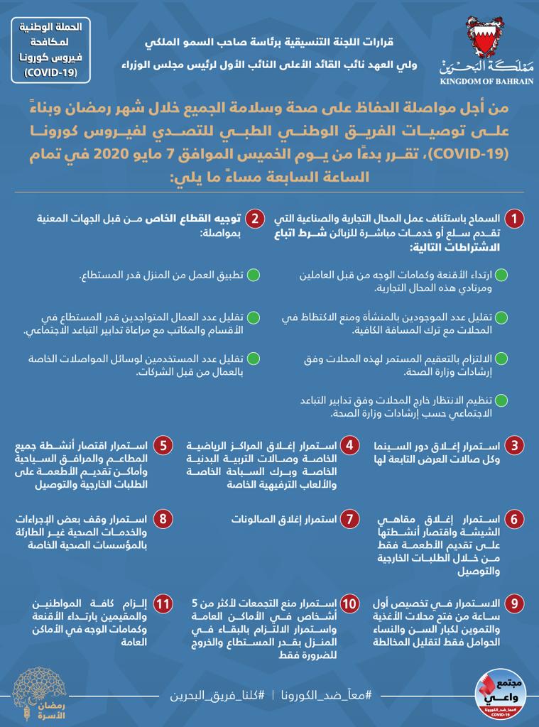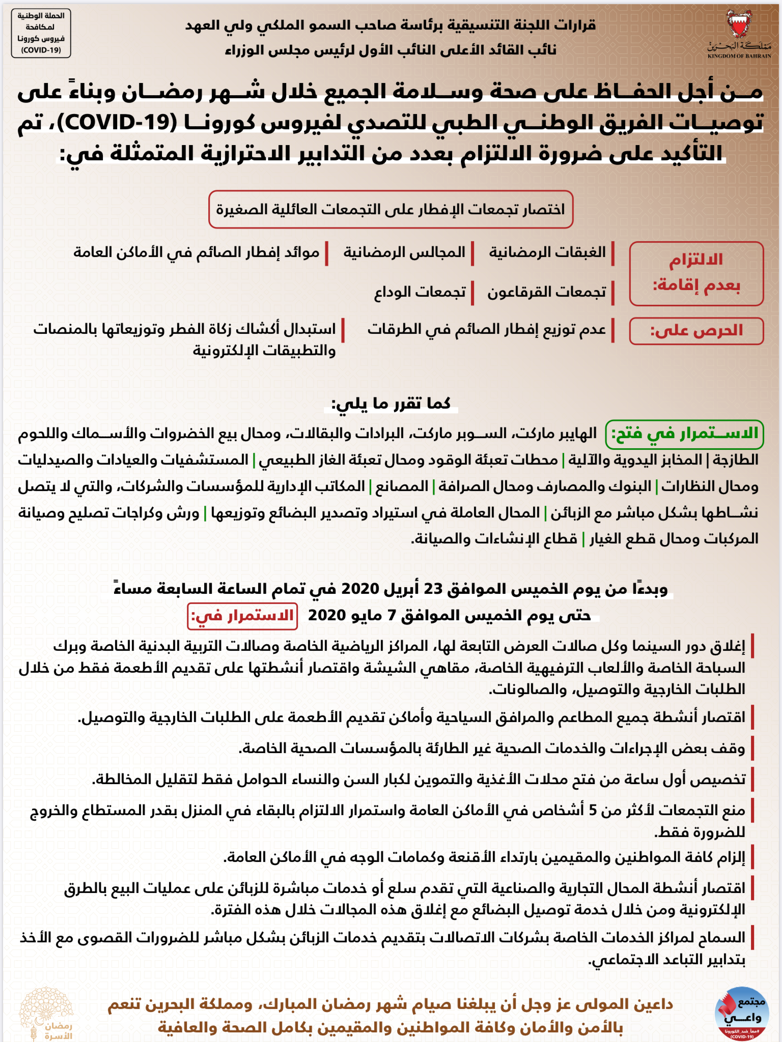 قرارات اللجنة التنسيقية برئاسة صاحب السمو الملكي ولي العهد نائب القائد الأعلى من أجل الحفاظ على صحة وسلامة الجميع خلال شهر رمضان