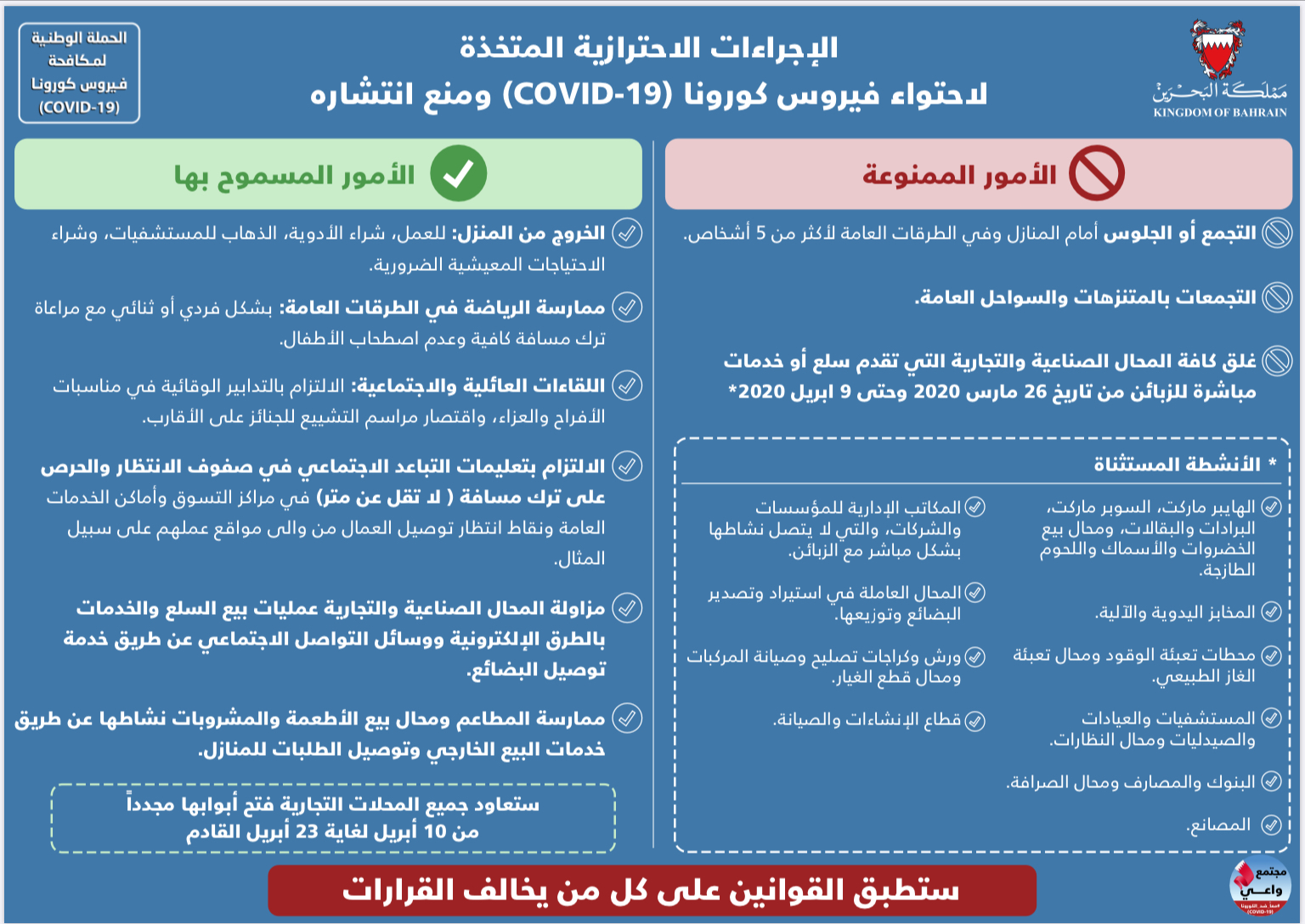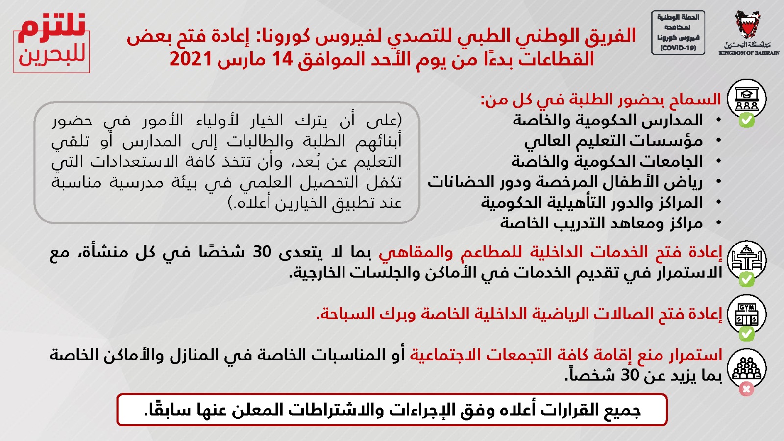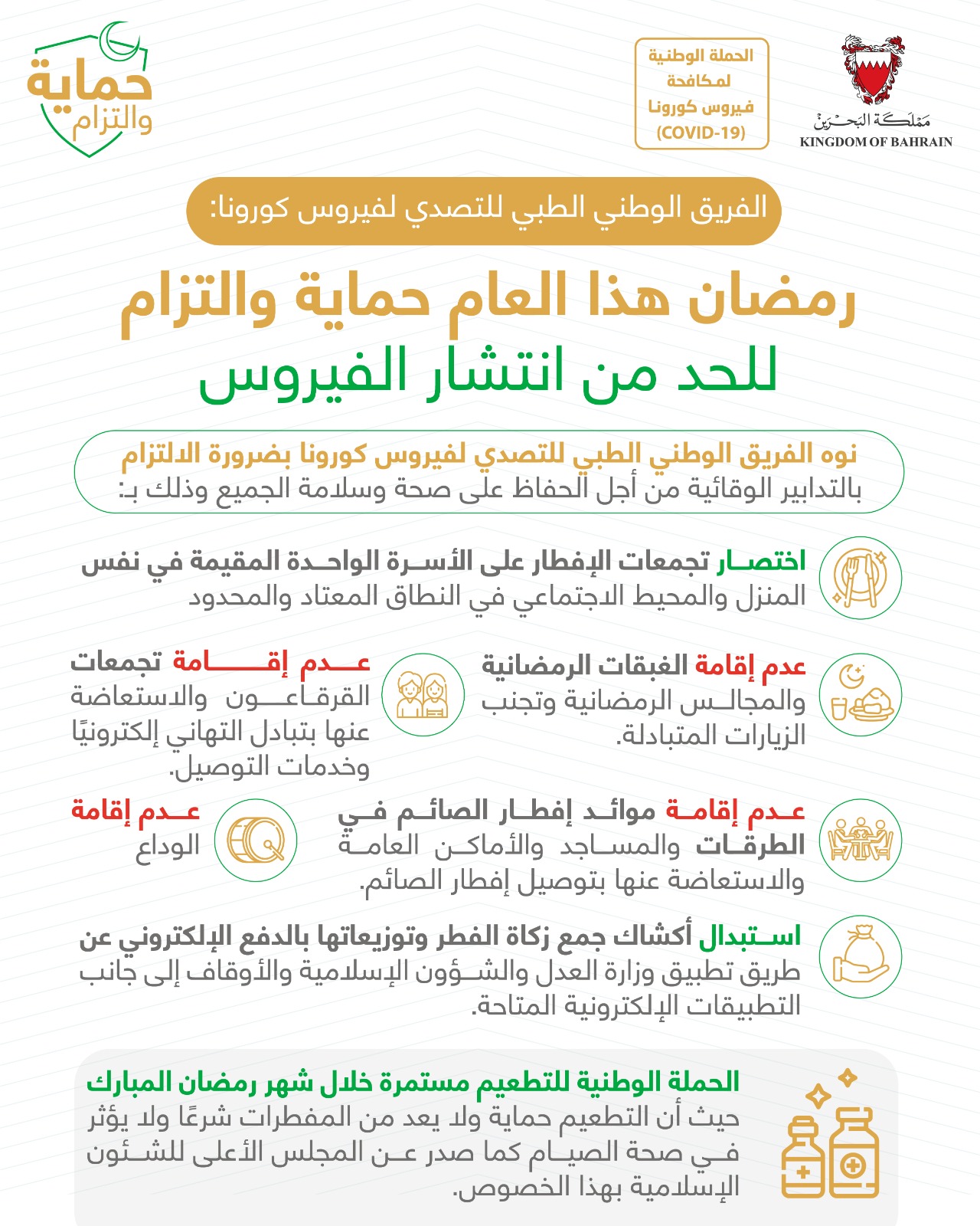 قرارات اللجنة التنسيقية برئاسة صاحب السمو الملكي ولي العهد نائب القائد الأعلى من أجل الحفاظ على صحة وسلامة الجميع خلال شهر رمضان