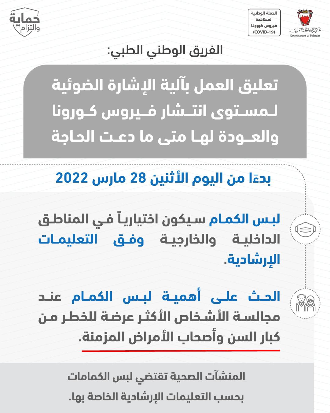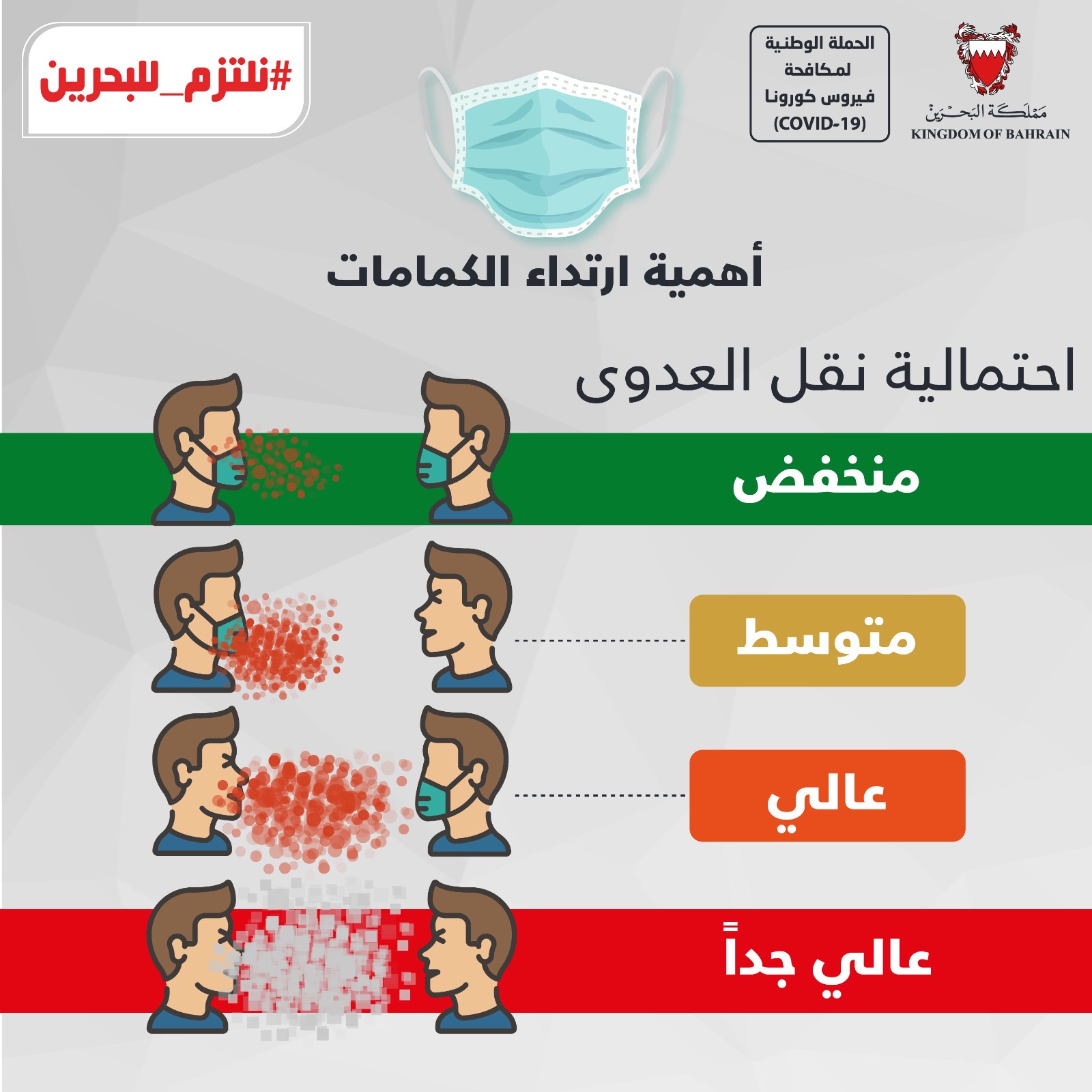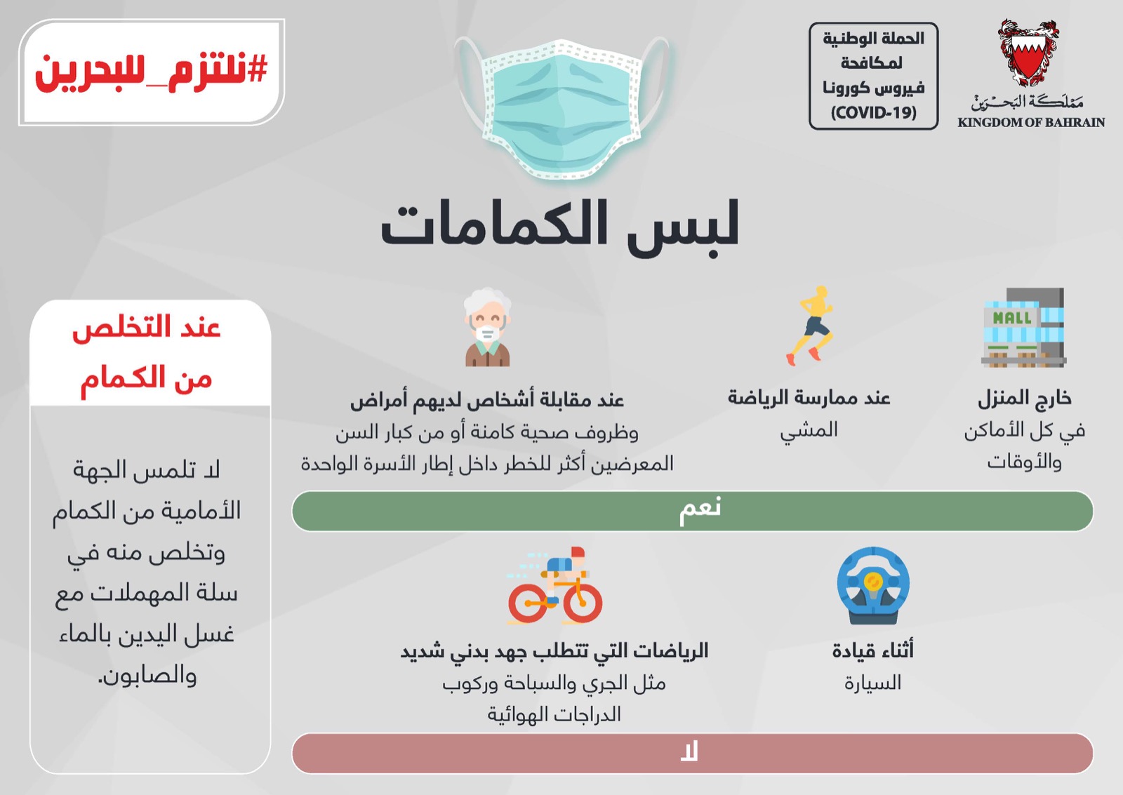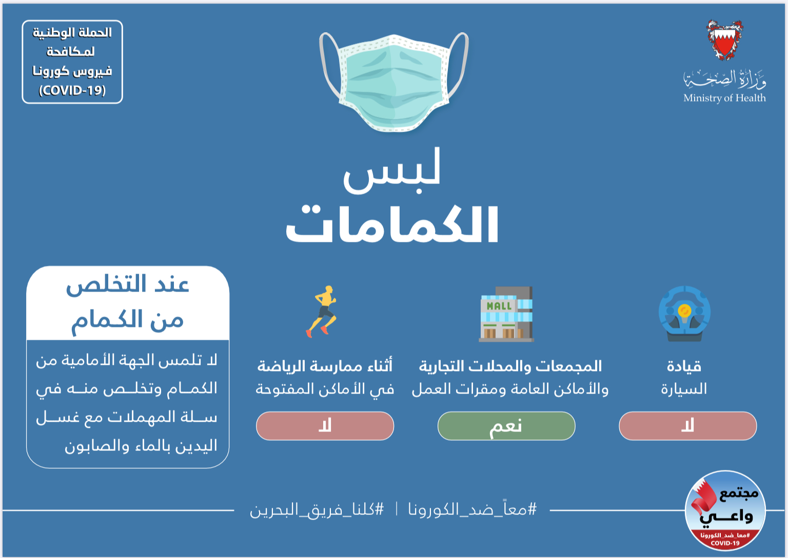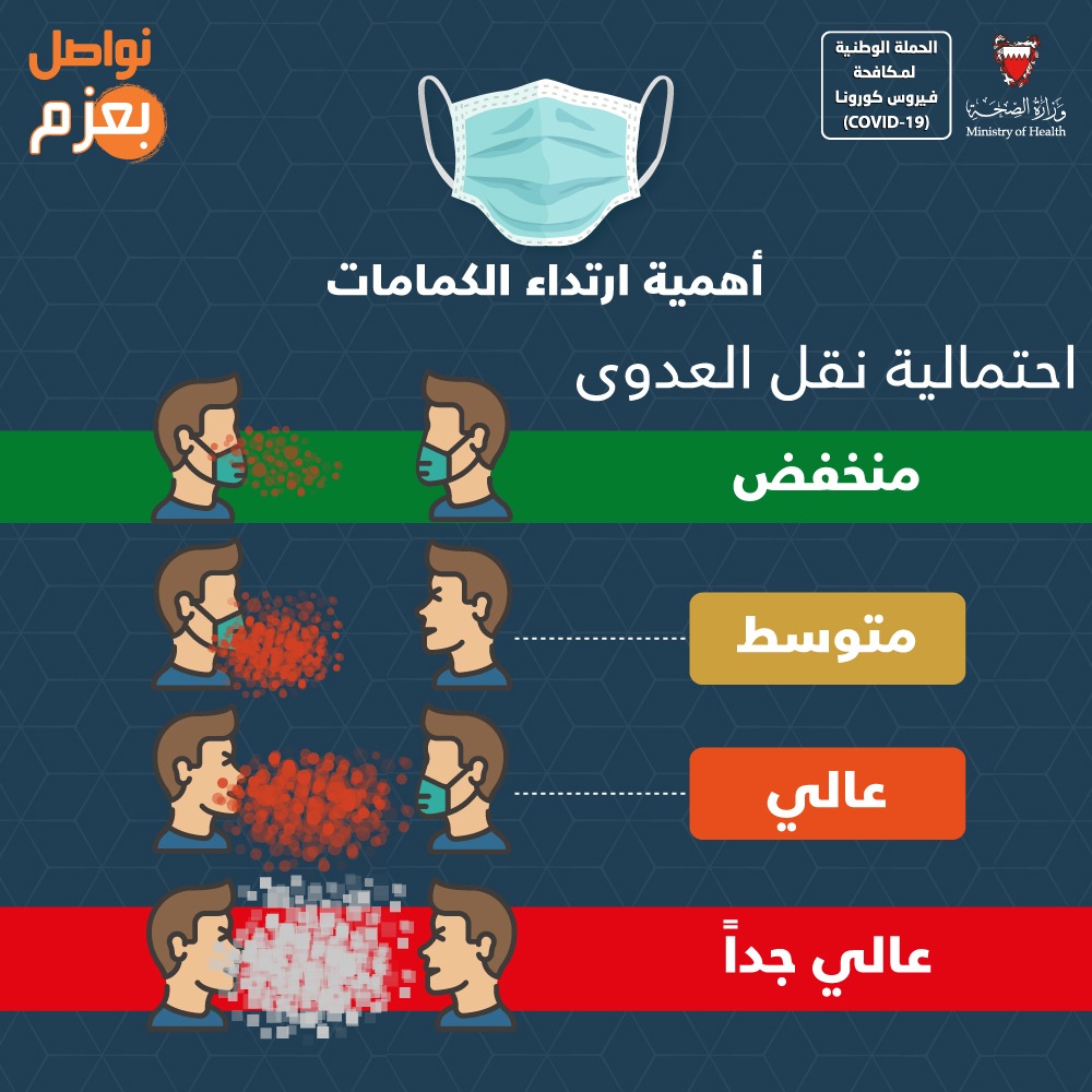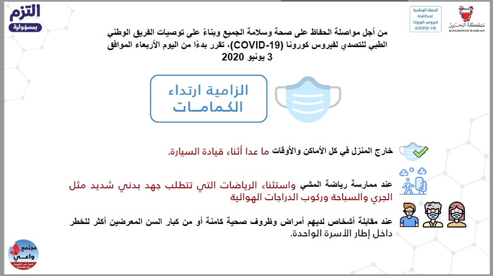 من أجل مواصلة الحفاظ على صحة وسلامة الجميع وبناءً على توصيات الفريق الوطني الطبي للتصدي لفيروس كورونا، تقرر بدءًا من اليوم الأربعاء الموافق 3 يونيو 2020 إلزامية ارتداء الكمامات