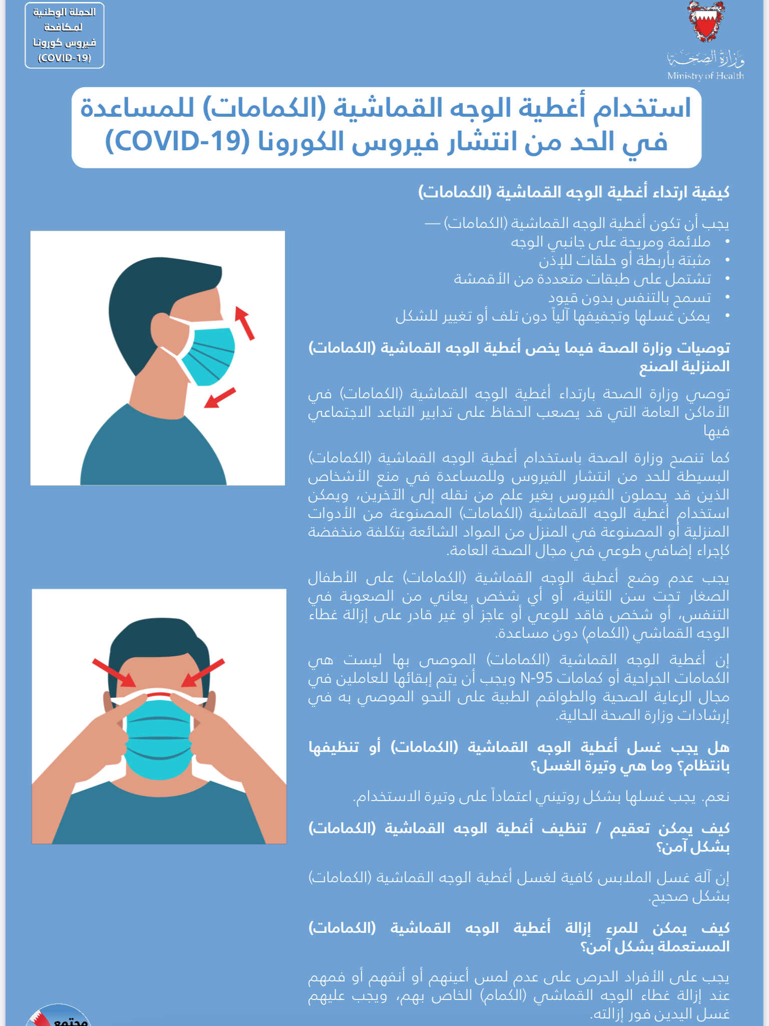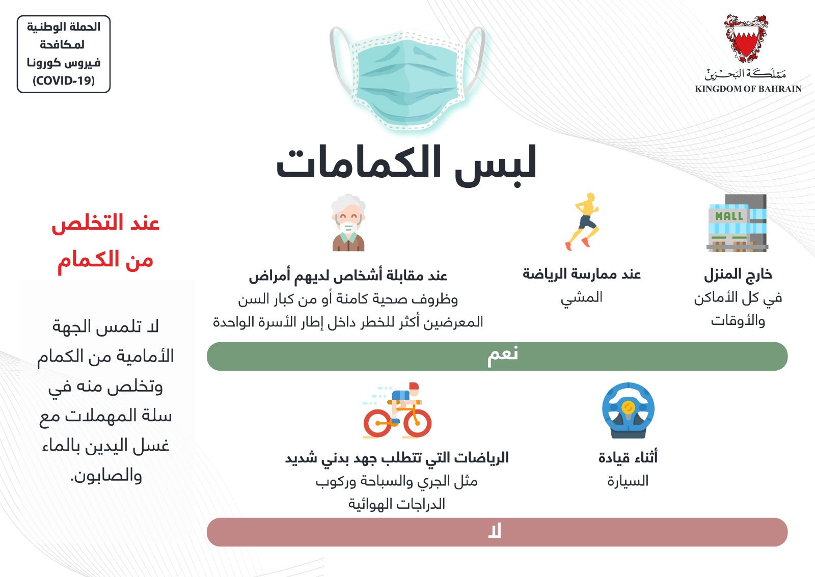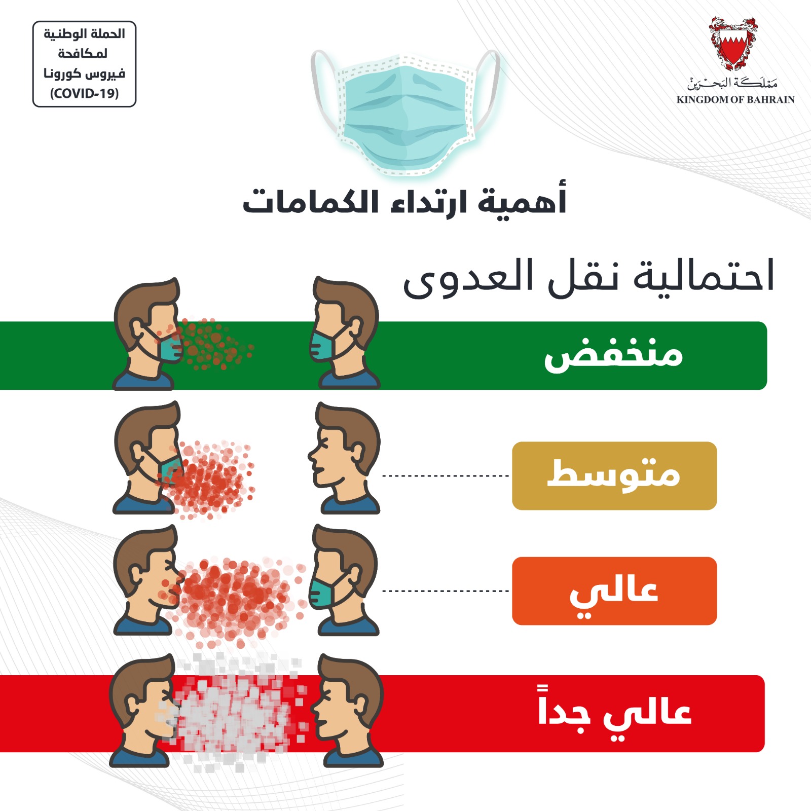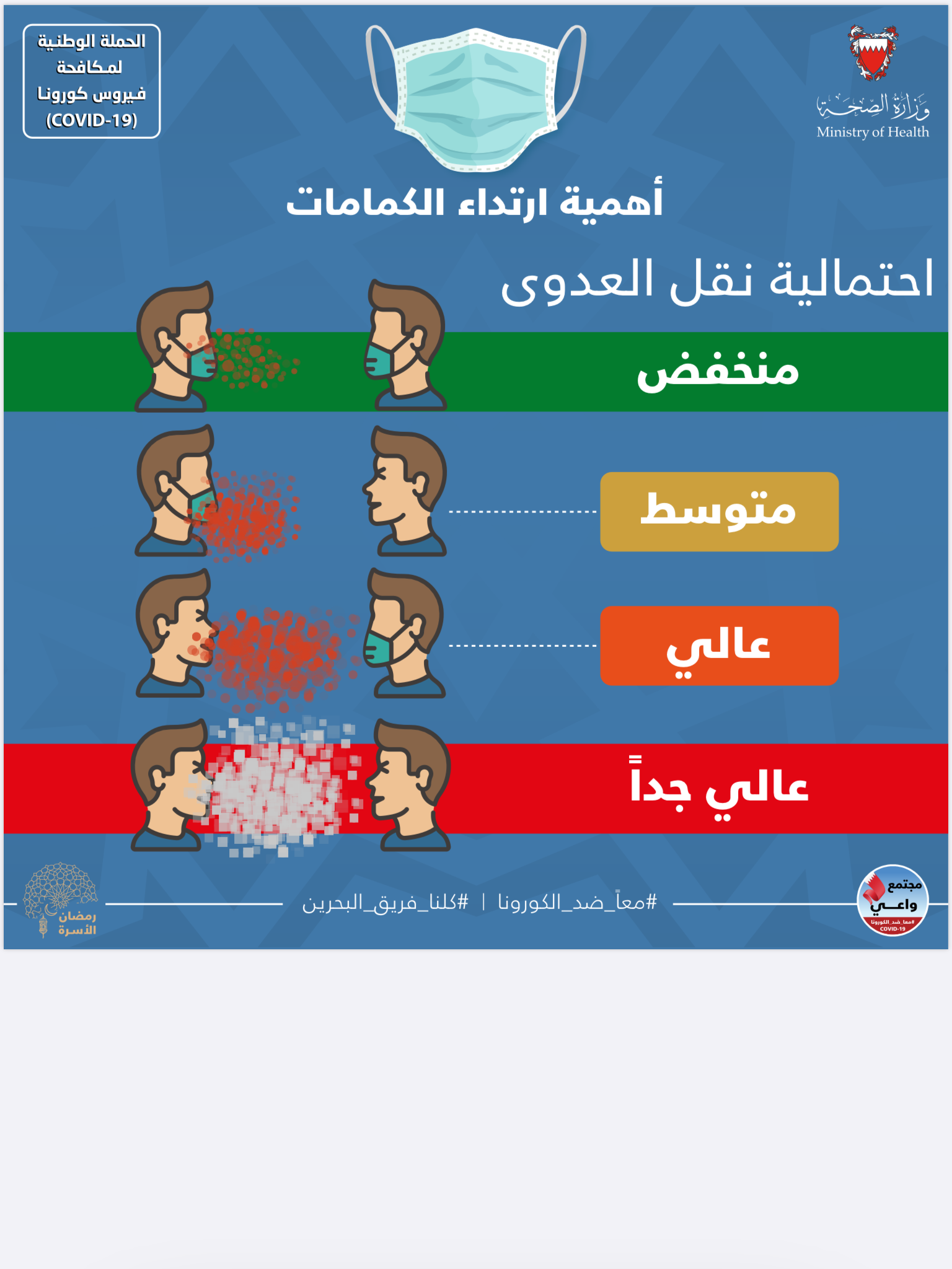 من أجل مواصلة الحفاظ على صحة وسلامة الجميع وبناءً على توصيات الفريق الوطني الطبي للتصدي لفيروس كورونا، تقرر بدءًا من اليوم الأربعاء الموافق 3 يونيو 2020 إلزامية ارتداء الكمامات