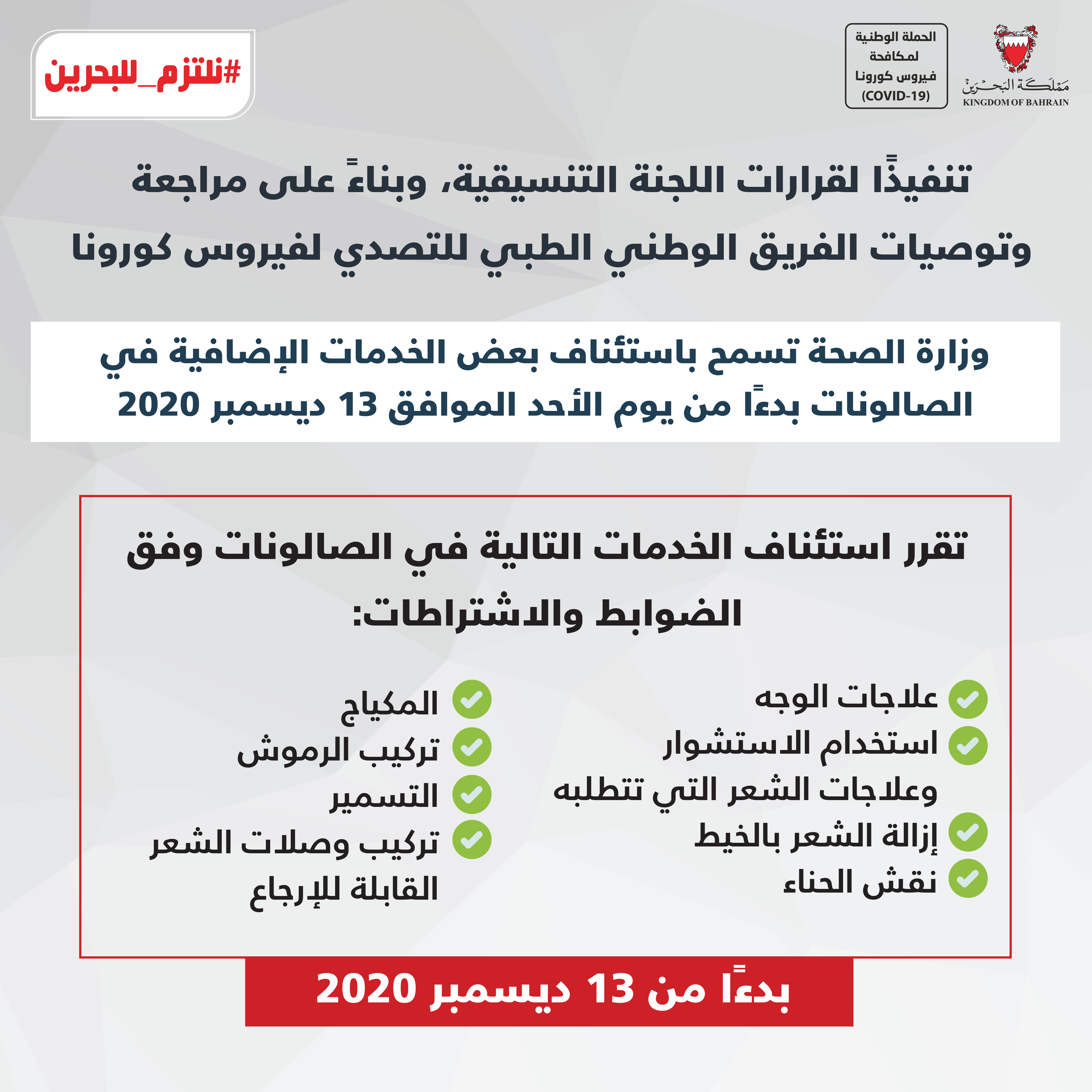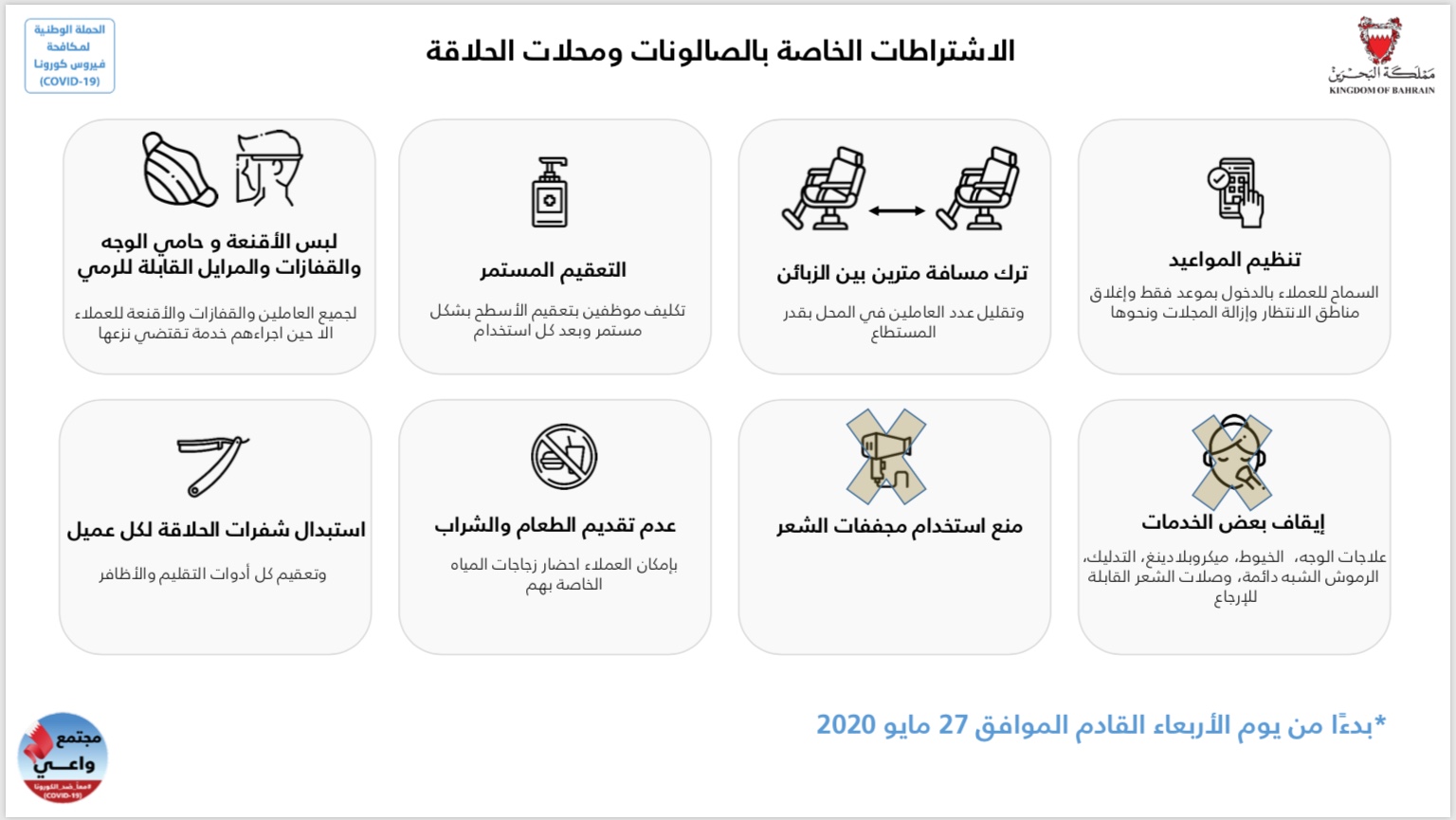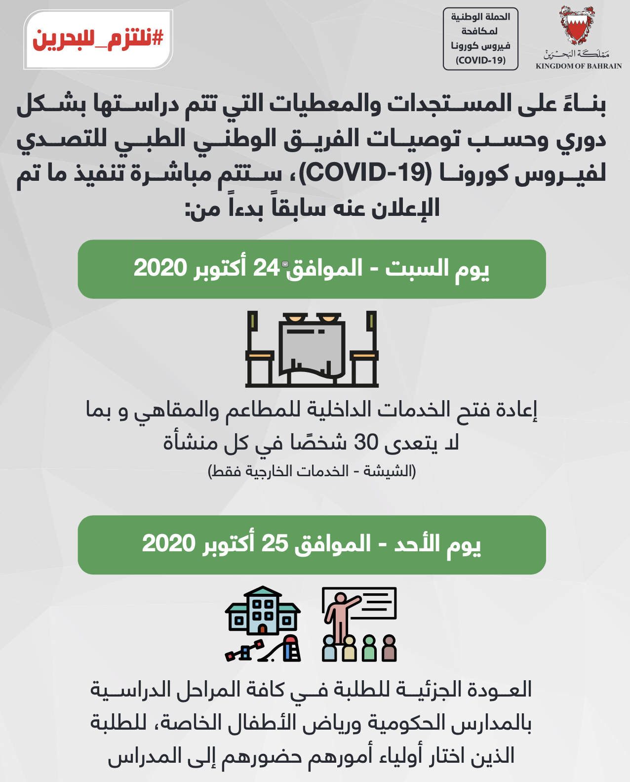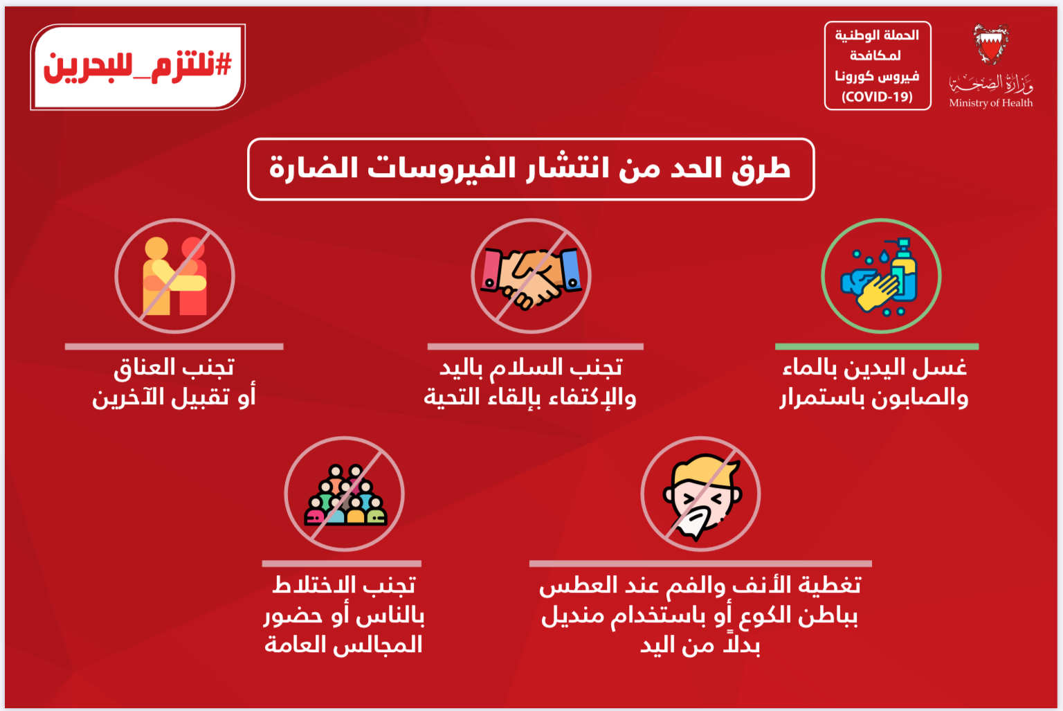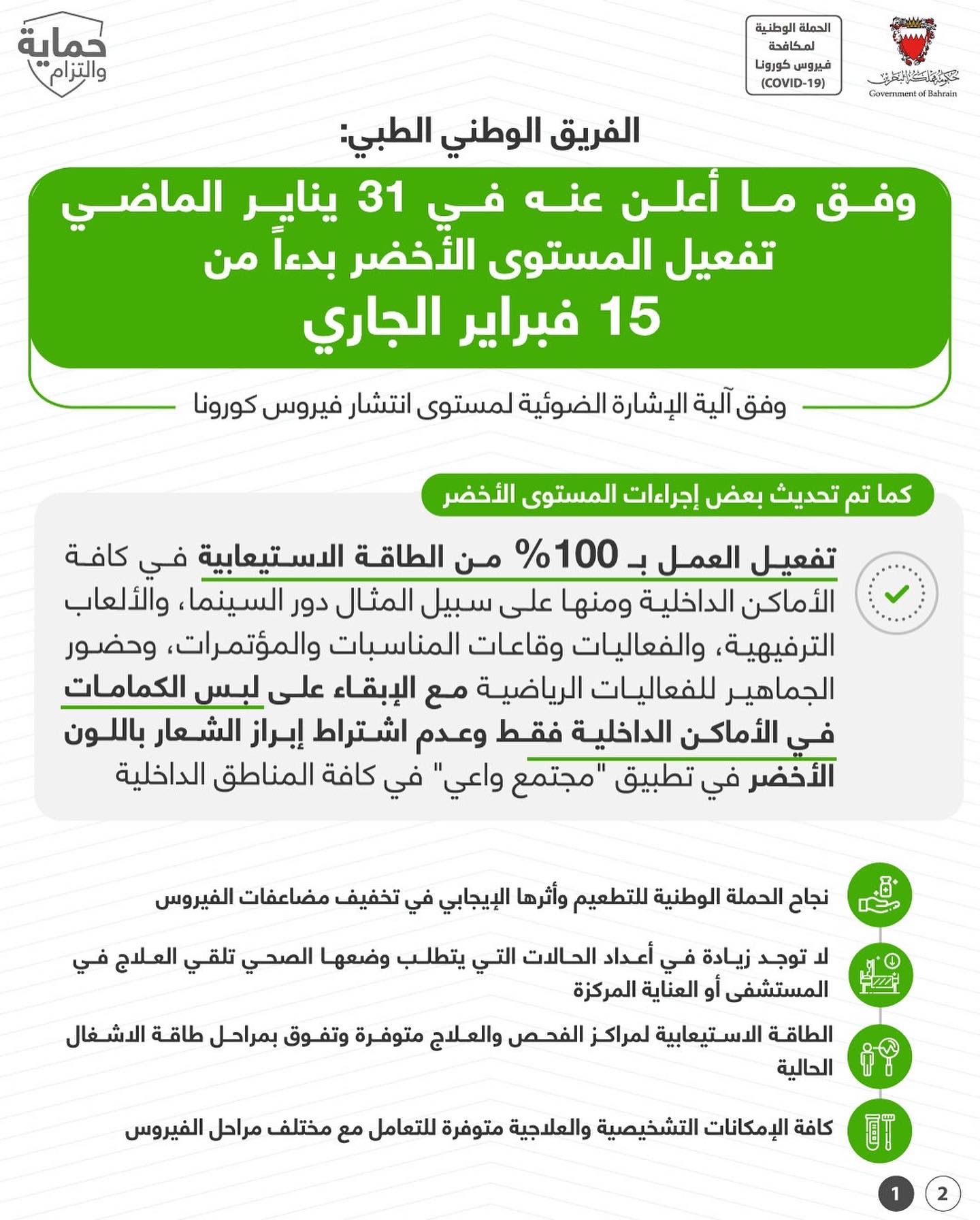 من أجل مواصلة الحفاظ على صحة وسلامة الجميع وبناءً على توصيات الفريق الوطني الطبي للتصدي لفيروس كورونا، تقرر بدءًا من اليوم الأربعاء الموافق 3 يونيو 2020 إلزامية ارتداء الكمامات