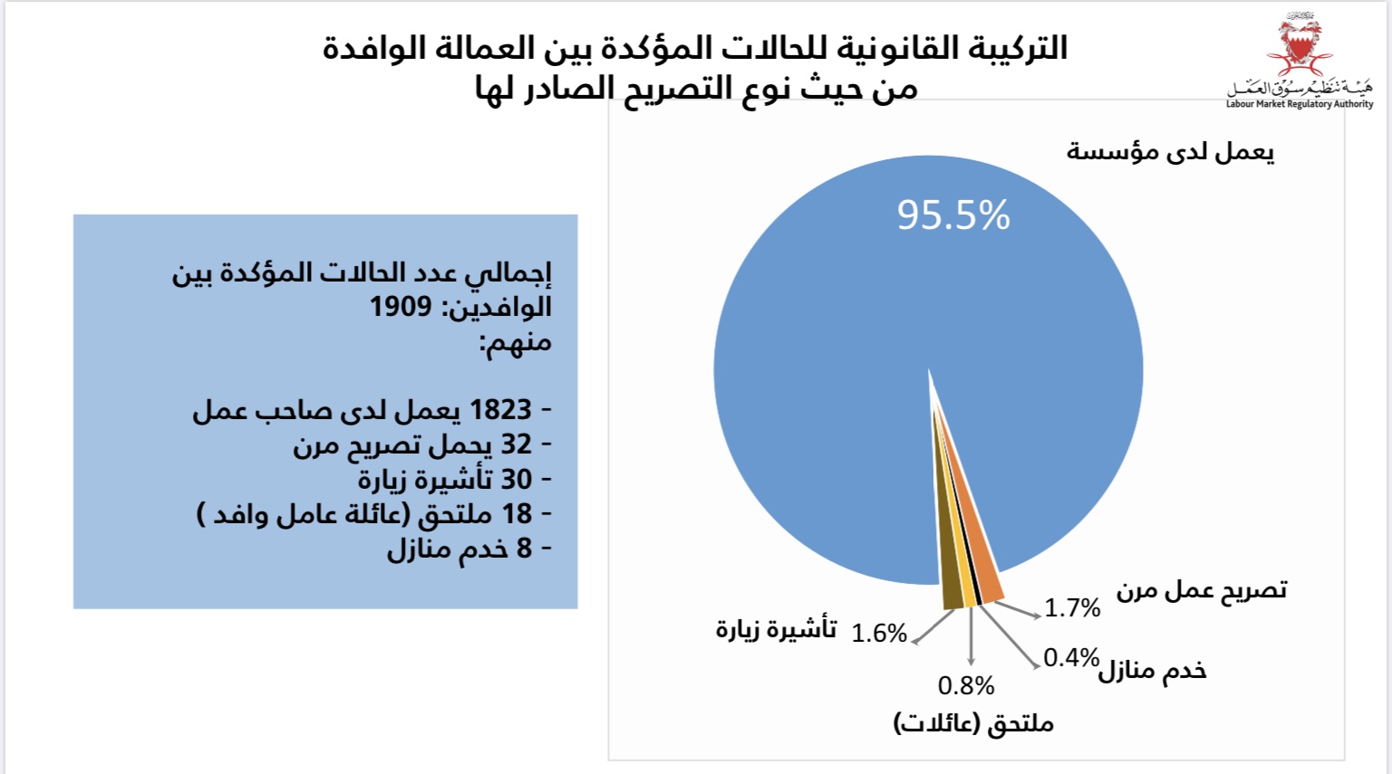 التركيبة القانونية للحالات المؤكدة بين العمالة الوافدة من حيث نوع التصريح الصادر لها