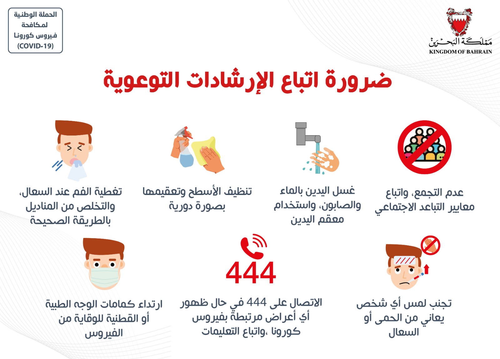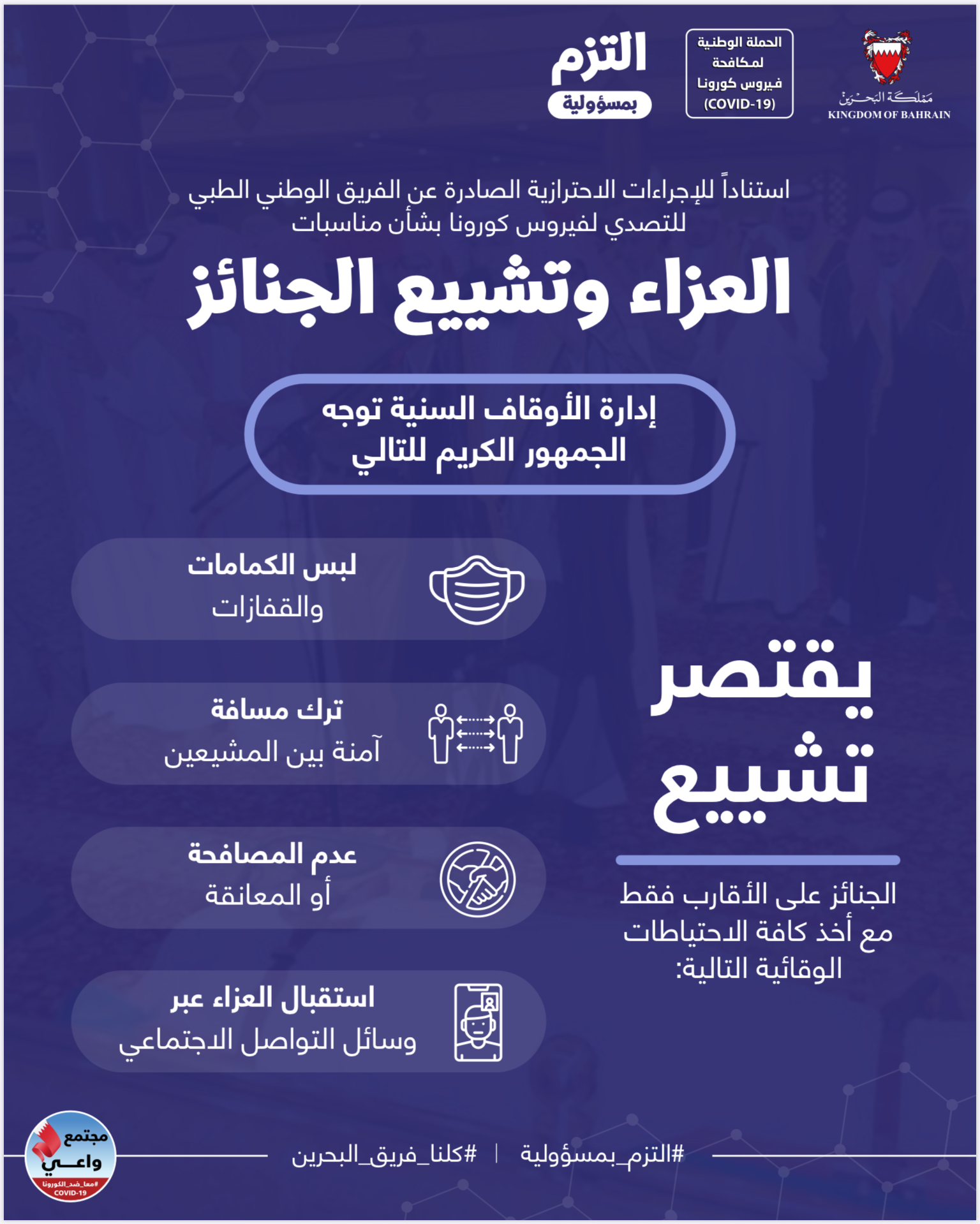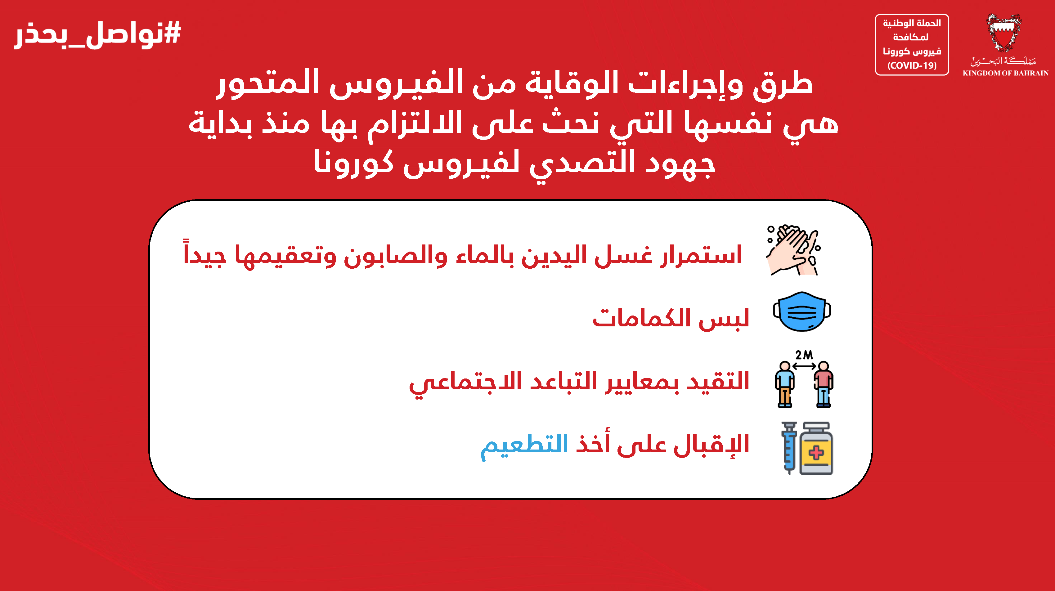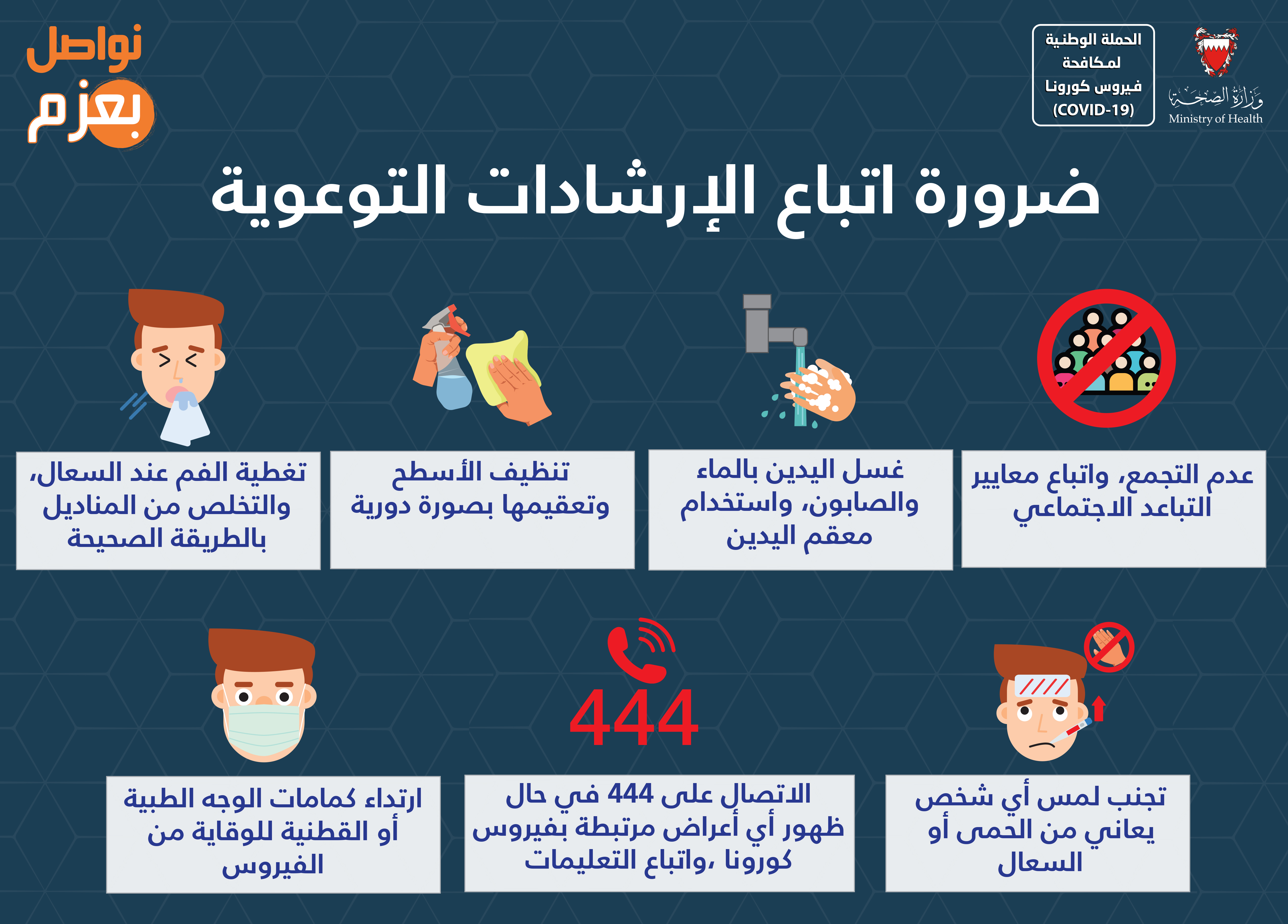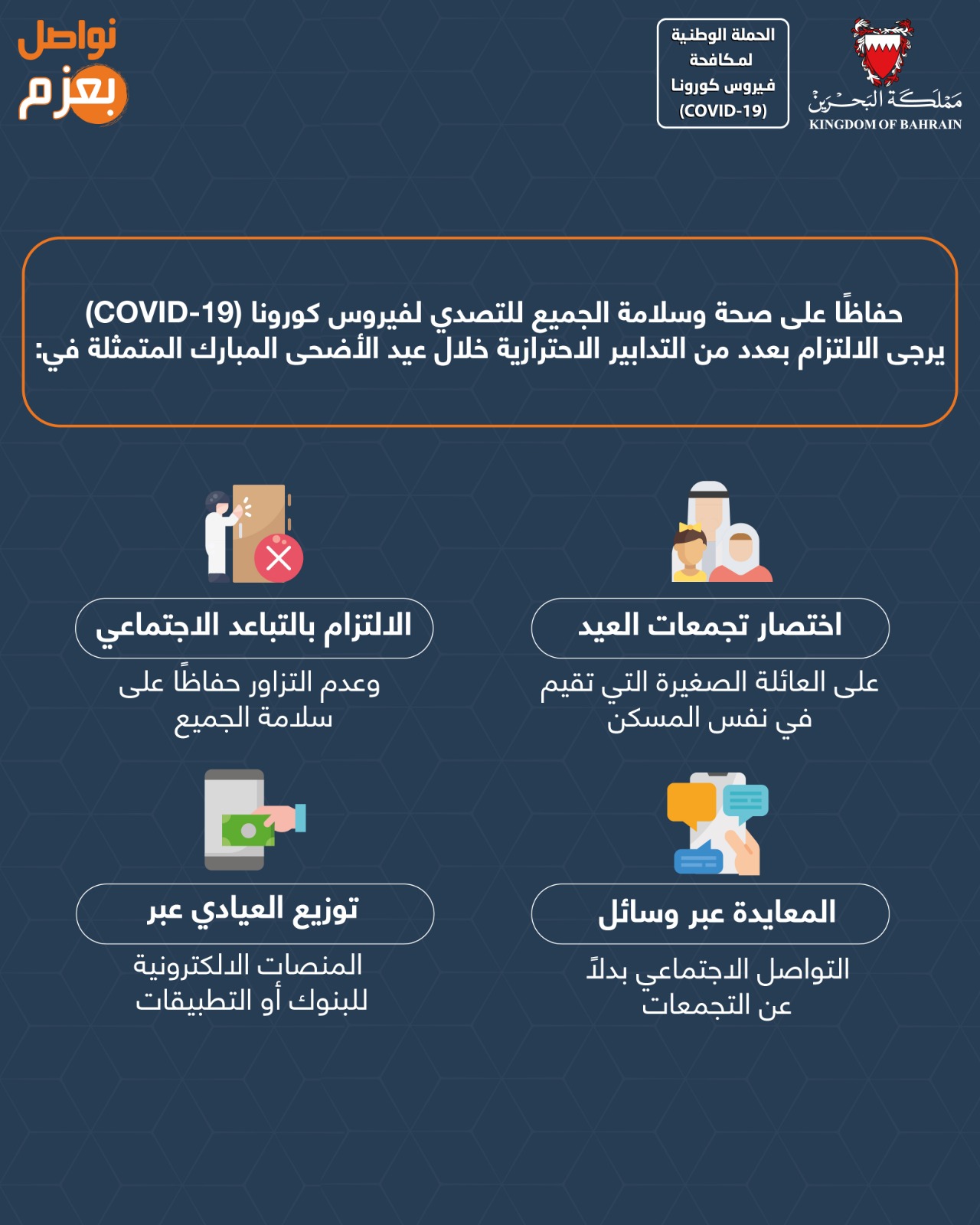 حفاظاً على صحة وسلامة الجميع للتصدي لفيروس كورونا (كوفيد-19) يرجى الالتزام بعدد من التدابير الاحترازية خلال عيد الاضحى المبارك