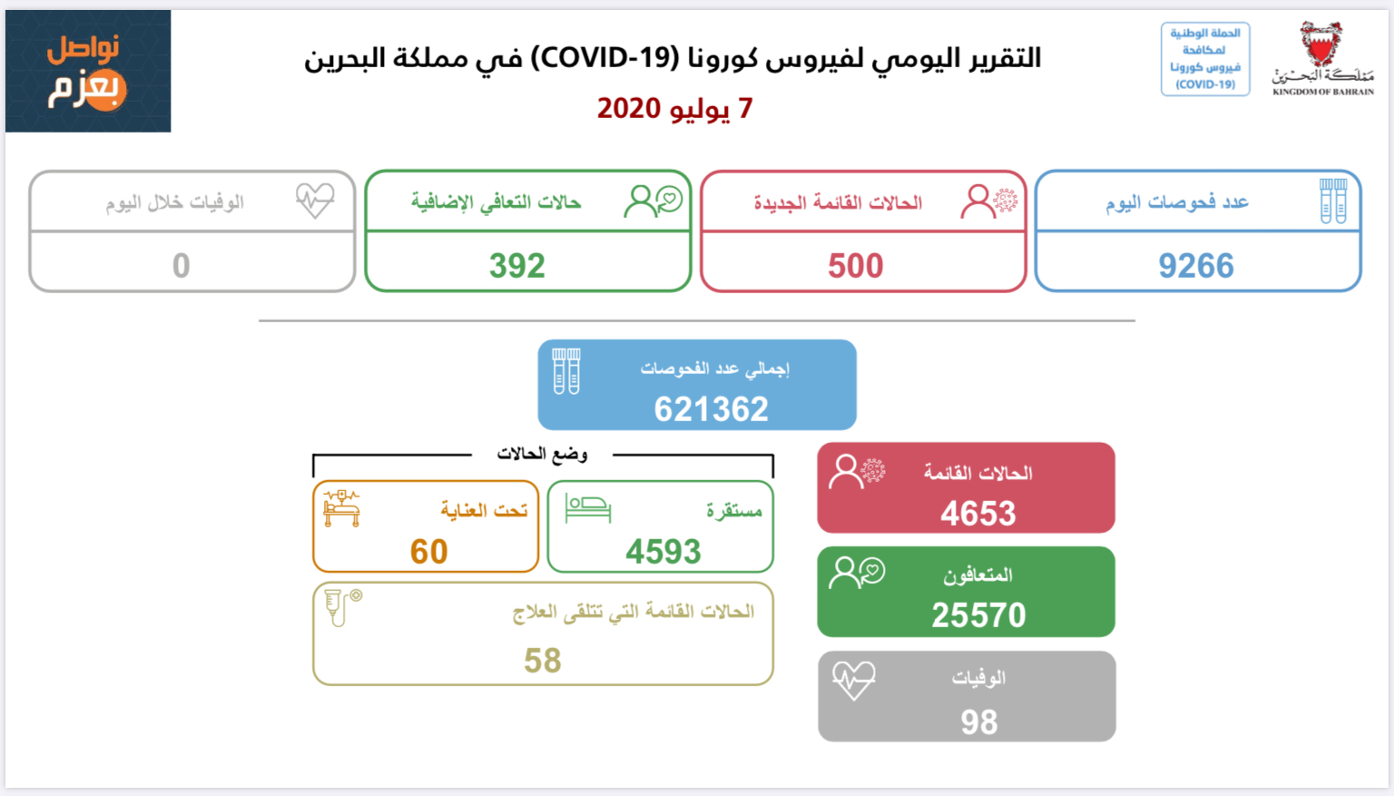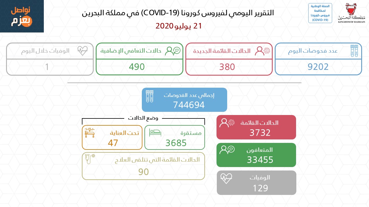 التقرير اليومي لفيروس كورونا (19-COVID) في مملكة البحرين 21-07-2020