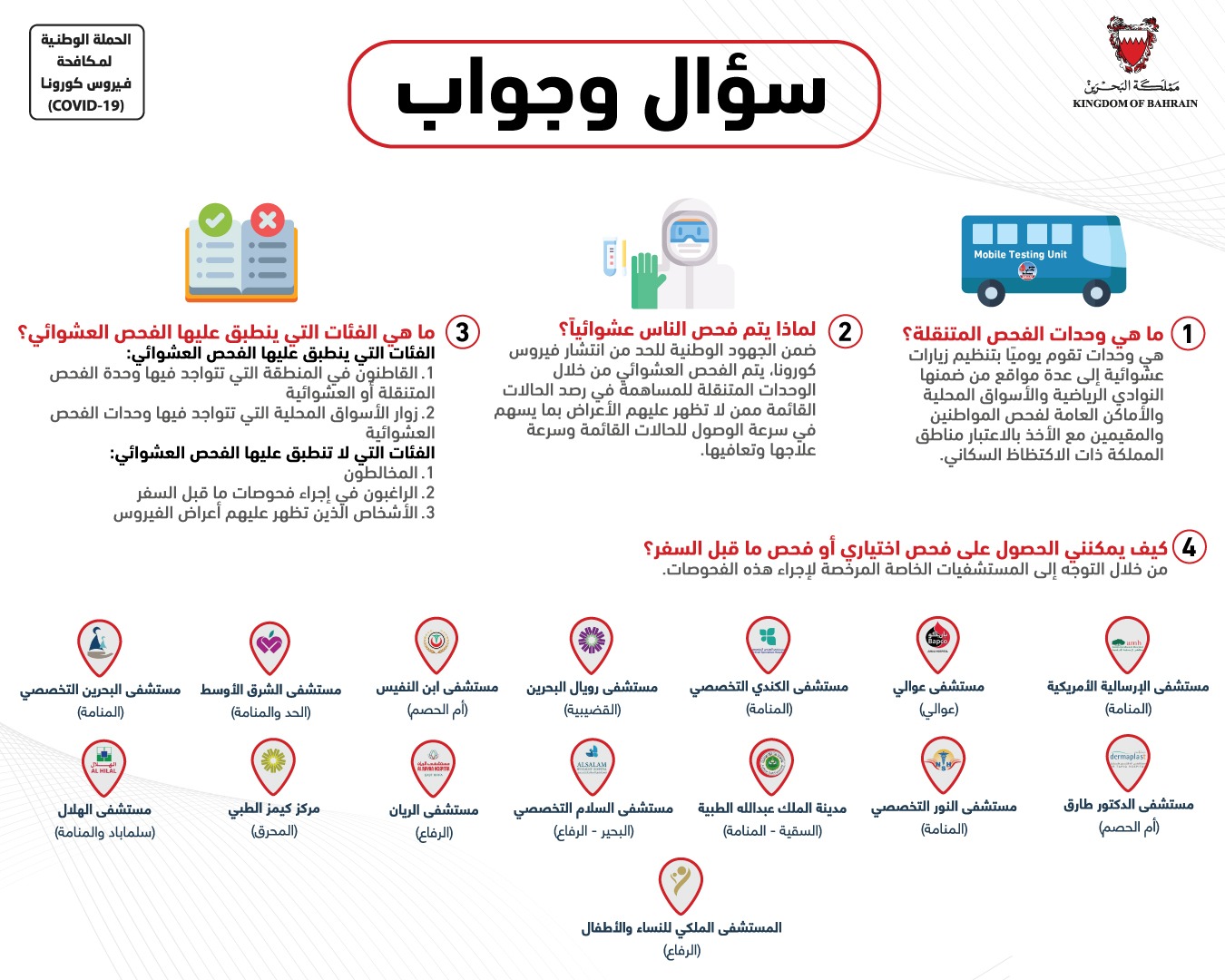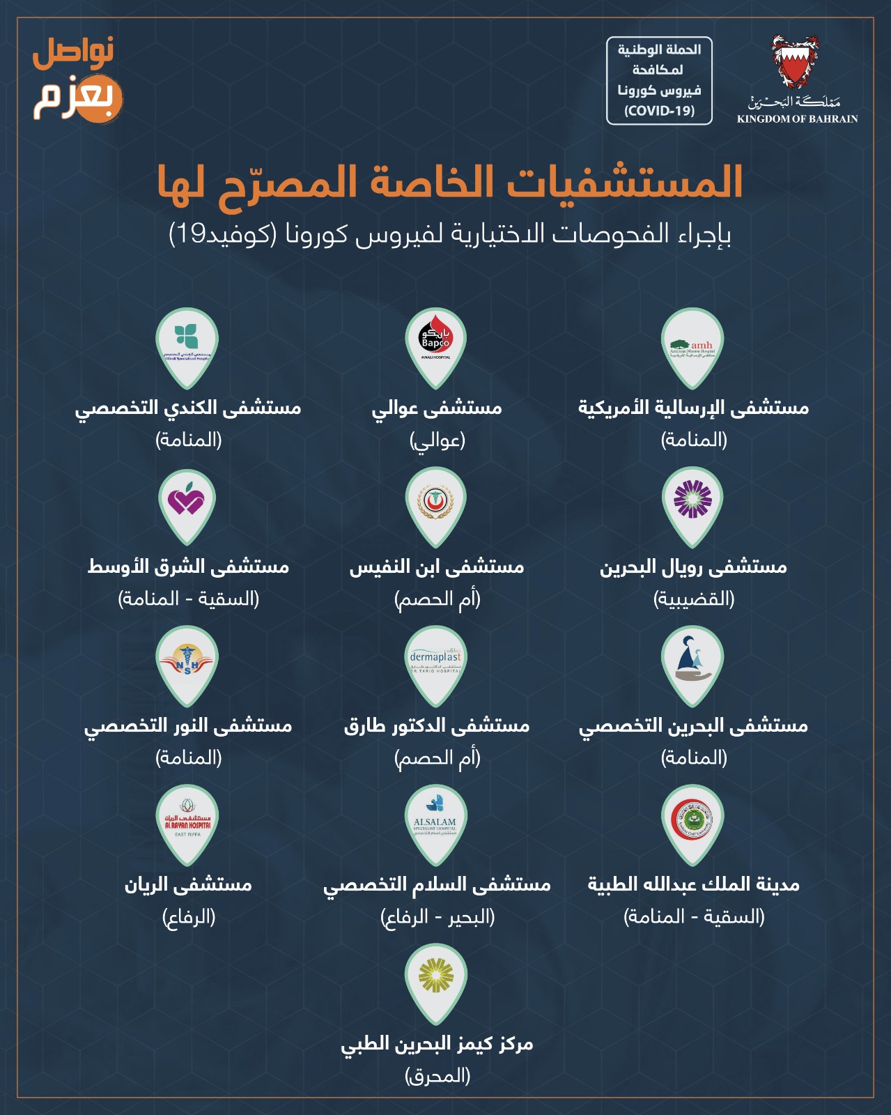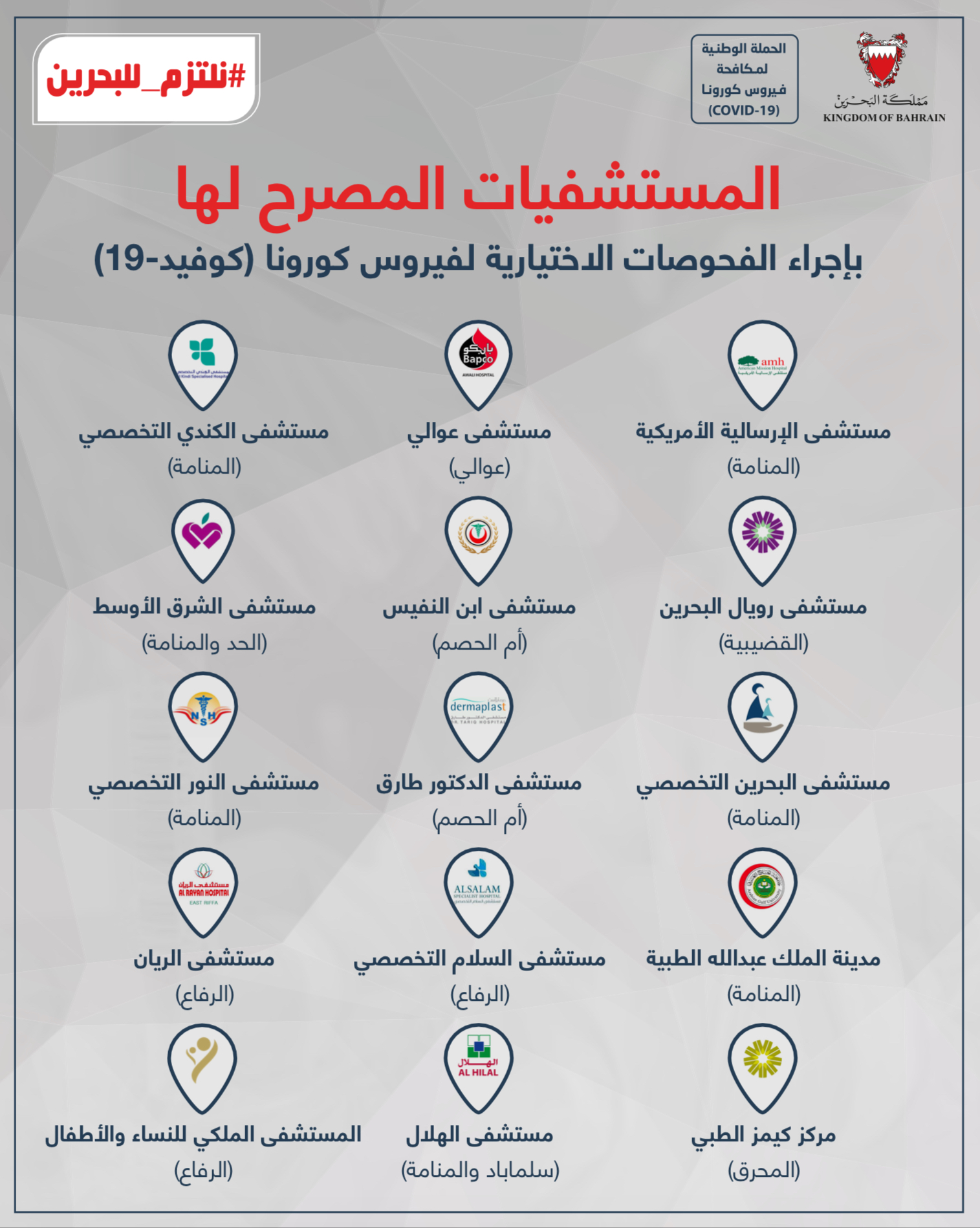 المستشفيات المصرح لها بإجراء الفحوصات الاختيارية لفيروس كورونا (كوفيد-19)